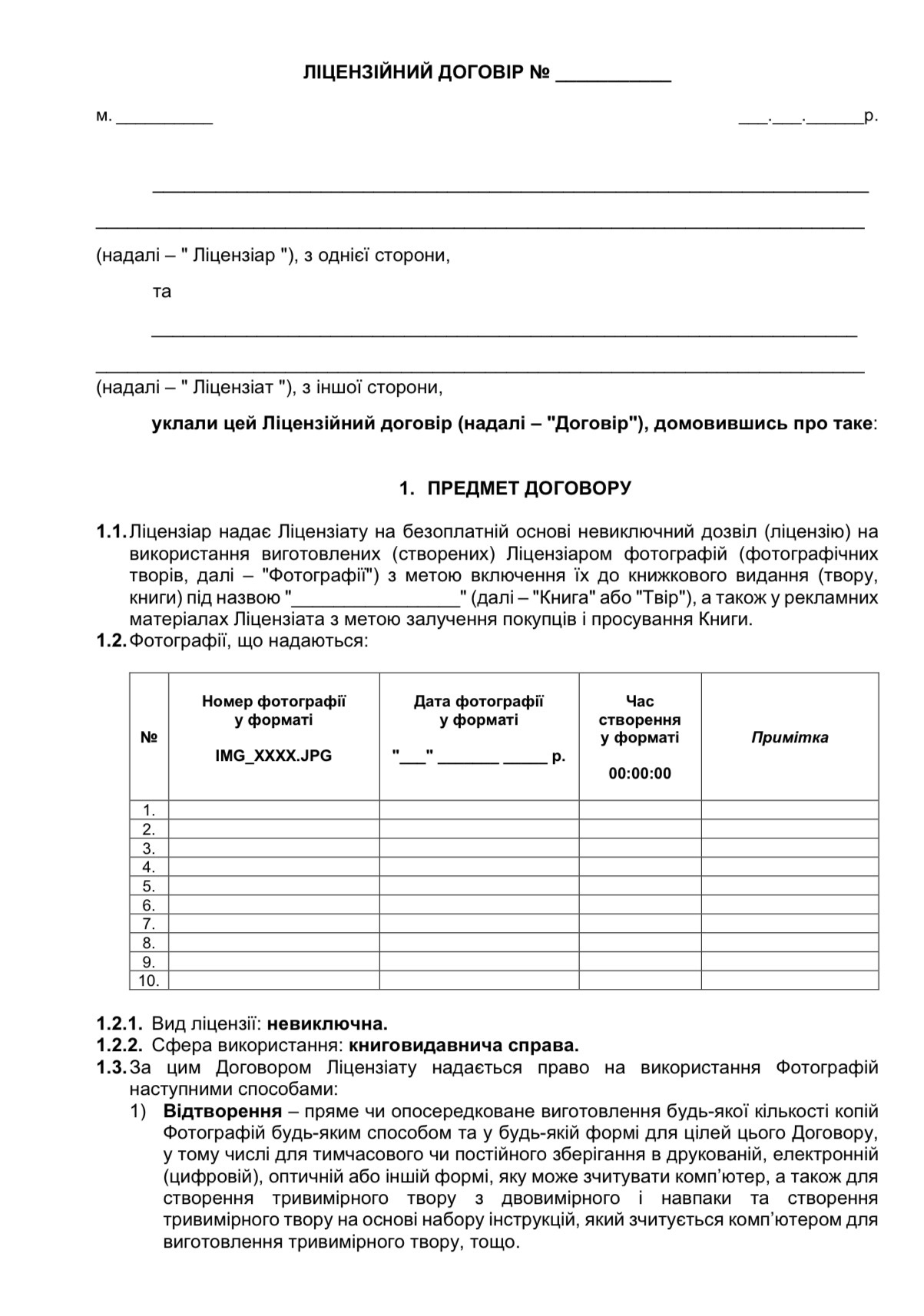 Ліцензійний договір зразок якого ви можете завантажити передбачає надання ліцензії на використання створених фотографом фотографій з метою включення їх до книги чи іншого видання (як приклад).